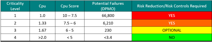 Calculating a criticality number is best done using actual failure data. One approach is to use the potential failures from sigma levels as shown in Table 3. When the process capability (Cpu) of a cleaning process is known, a criticality level can be easily assigned.
