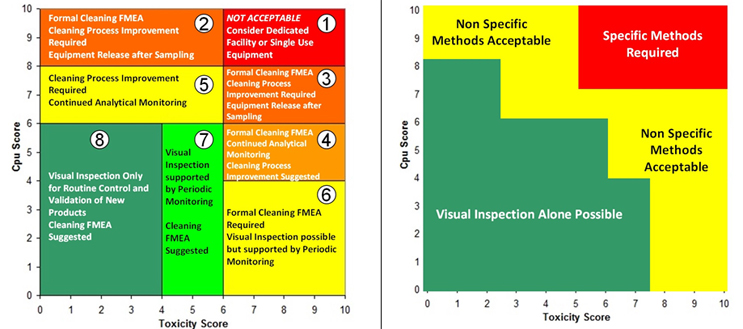 Figure 3: Two Examples of the Shirokizawa Matrix from ASTM E31062 – The example on the left shows the Shirokizawa matrix used for the selection of a cleaning control strategy.11 The matrix is broken into eight areas based on the toxicity and process capability scores of the compound being evaluated. The example on the right shows the specific or non-specific methods selected based on toxicity score and Cpu Score. This matrix can be used as a visual guide to assist in the risk-based selection of methods. Click on the figure image to enlarge.