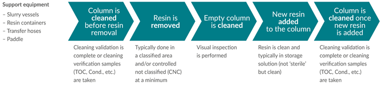 This step involves removing the “cleaned resin” from the column. Typically, this is in a controlled area or a “controlled not classified” area as a minimum. Removing residual resin may be done through automated or manual steps and should meet the criteria for visually clean. Residual resin from the previously packed resin bed, below the acceptance criteria for visually clean, does not pose a carryover risk.