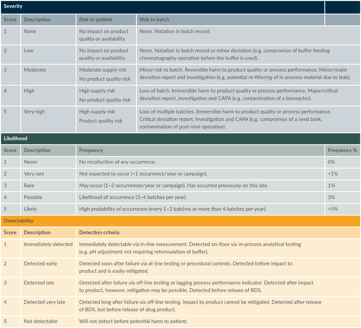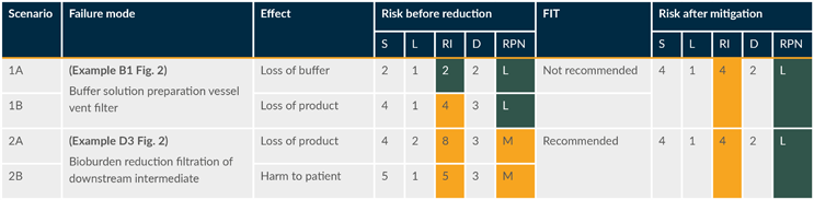 Table 2 shows assessments for two scenarios where sterilizing grade filters are used: a vent filter on a buffer preparation vessel (scenario 1) and a bioburden reduction filter used for a chromatography eluate (scenario 2, where the eluate is collected and held before processing. If this is a continuous process, the likelihood and severity may both be lower). Each failure mode includes multiple effects, which are shown in separate rows to distinguish the potential outcomes.