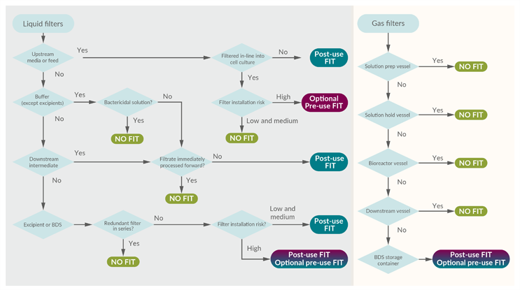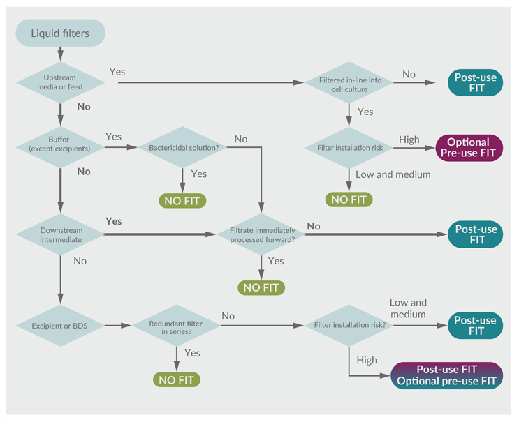 The recent revision of Annex 1 provides guidance and expectations around FIT with a special focus on pre-use and post-use testing. However, applying this guidance universally to low bioburden DS manufacturing (Annex 2) may be excessive. A risk-based approach should be followed for determining when and where to perform FIT. Based on this article, a decision tree model could be adapted to simplify the risk assessment. Each company may develop its own short list of questions and/or a similar decision tree to aid the consistent and accurate evaluation of the need for FIT performance.
