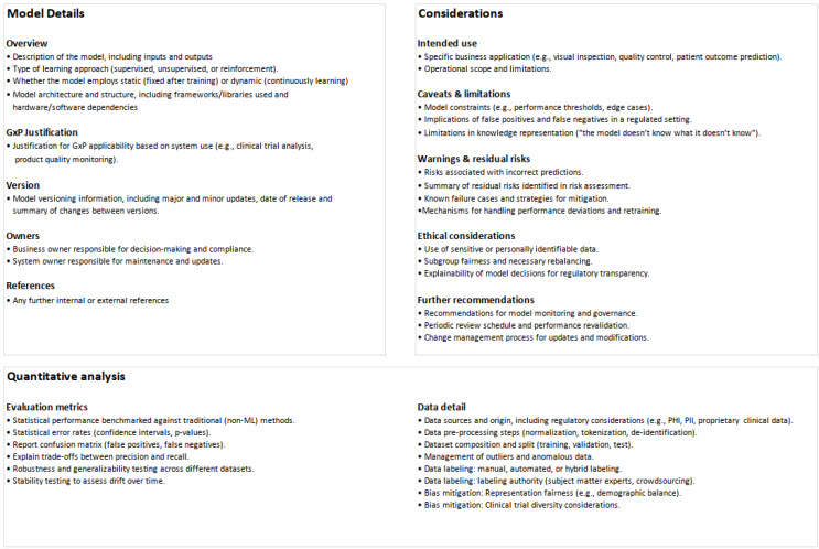 Datasheets and labels are already a standard way to document warnings and limitations in pharma. Model cards apply the same logic to AI, providing a streamlined way to answer critical compliance questions. Here’s a model card specifically designed to support fast QA and compliance feedback: