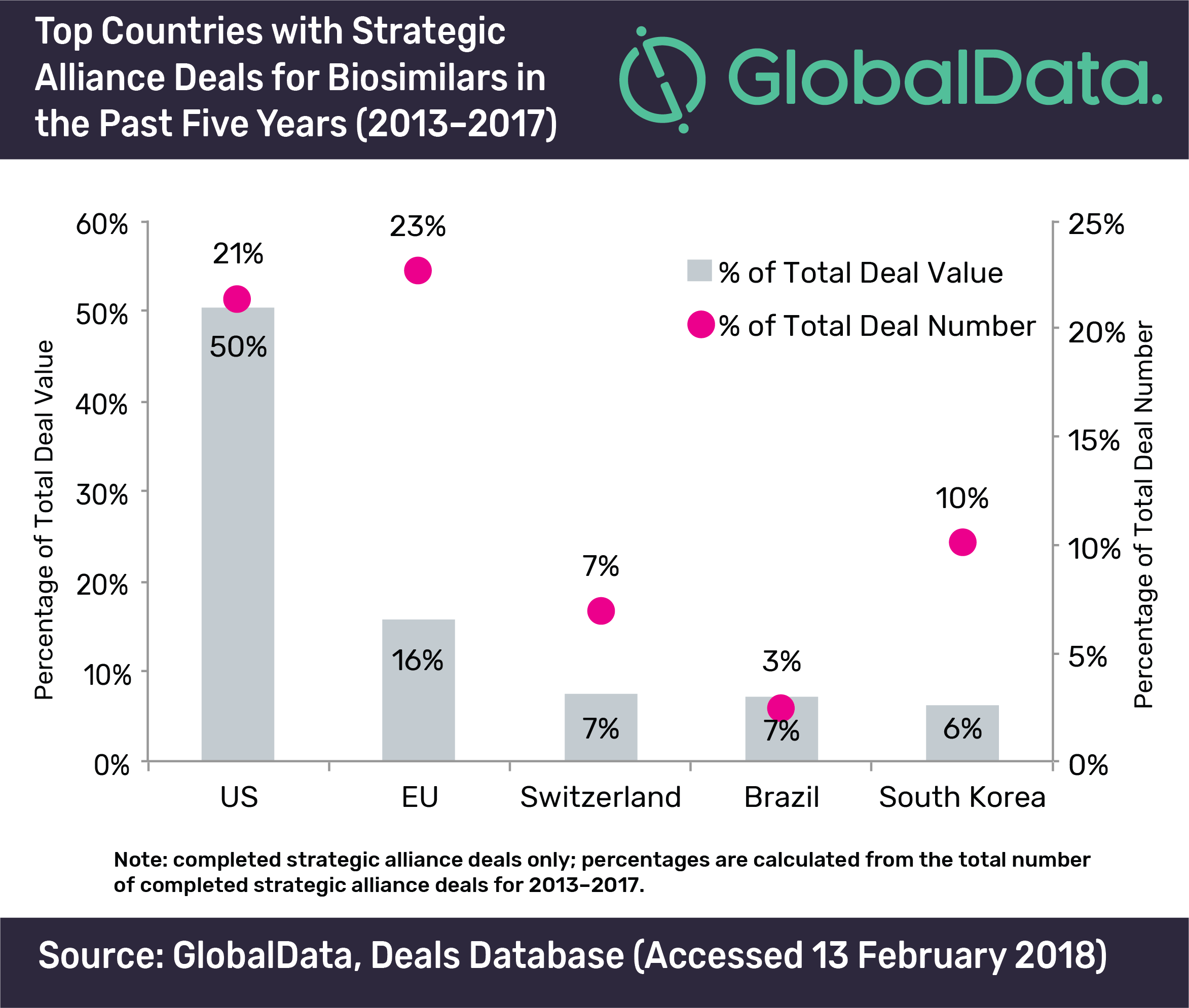 The EU as a whole has a larger proportion of deals compared to the US and these are predominately made up of Germany and the UK. Brazil and South Korea are also active in the biosimilar market.