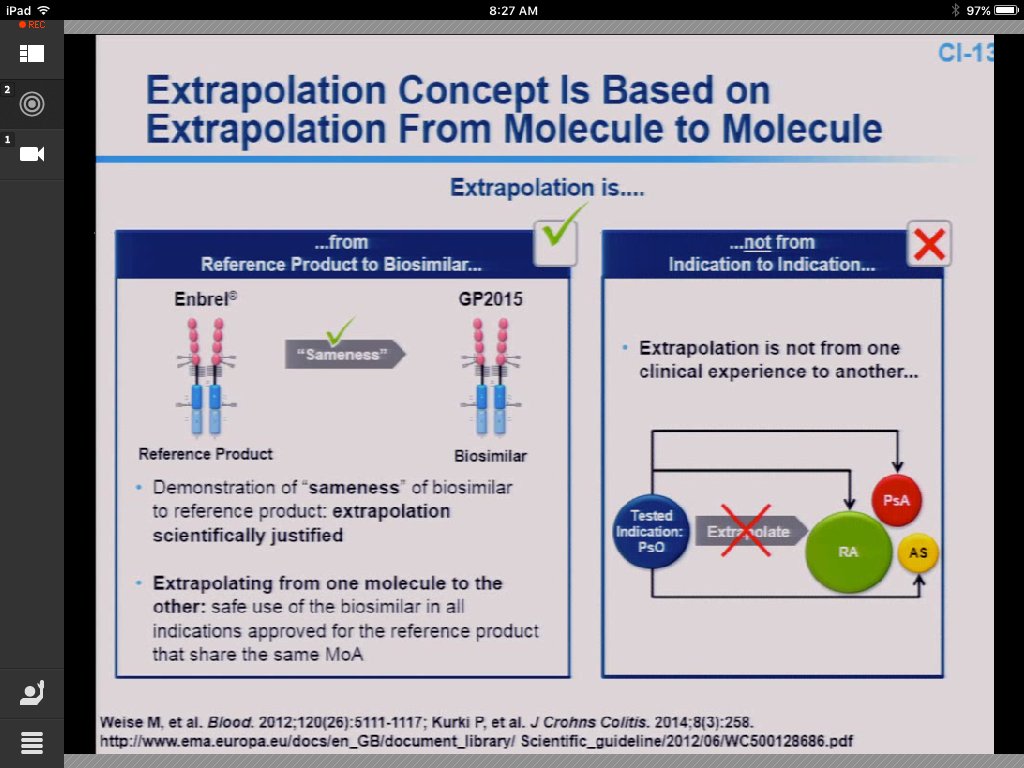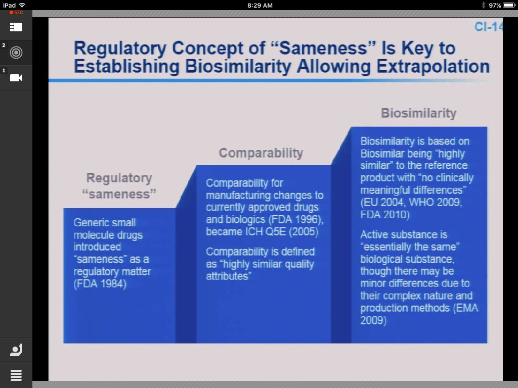 - “Sameness” Should Replace “Similarity”: When referencing Sandoz’s candidate, McCamish relied on the word “sameness” rather than similarity. In fact, the key to biosimilarity and extrapolation relies on the regulatory concept of sameness, which was established when small molecule generics hit the market. As McCamish said, it is the biosimilar manufacturer’s job to provide “copious information our molecule is the same.” The manufacturer must continue to emphasize that the active substance is “essentially the same,” regardless of small structural differences because of the complexity of the molecule and the processes creating it.