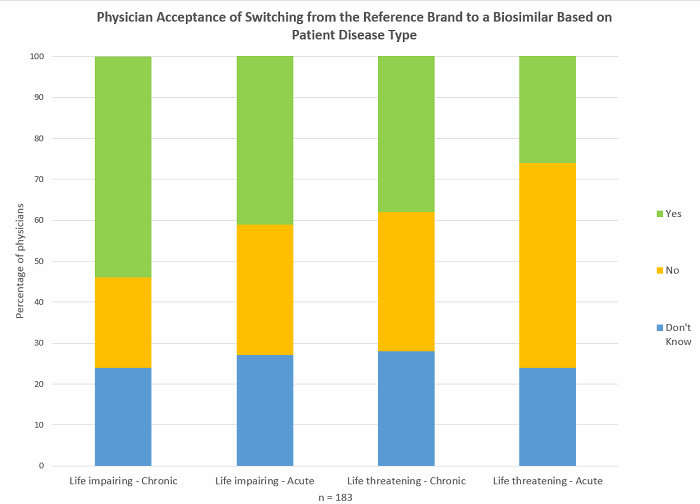 Designating individual HCPCS codes to each biosimilar will reduce the potential of less favourable reimbursement for certain biosimilars, allowing prescribing physicians more choice as to which biosimilar patients receive. Physician preferences for specific biosimilars may depend on several factors beyond cost, such as their inclusion in treatment guidelines, the data they have available, and marketing efforts (see Figure 1). Advocates for the coding policy change also put forward the argument that grouping several biosimilars under one HCPCS code could lead to inadvertent switching between biosimilars. At a time when physicians are yet to become fully comfortable with switching from a brand to a biosimilar (see Figure 2) and are demanding more data on the topic, switching between different biosimilars to the same reference brand, which is yet to be evaluated in clinical trials, is highly undesirable.