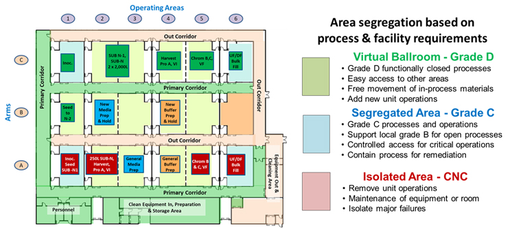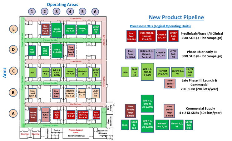 The design features of the operating core allow for a wide variety of quality management system (QMS) controlled area segregation options for introducing, operating, and removing processes that have been subdivided into logical operating units (LOUs). All manufacturing processes can be easily divided into groups of unit operations for distribution within the facility in a wide variety of configurations.