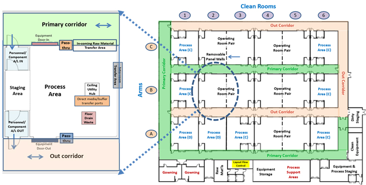 Each area is also connected to a CNC (controlled non-classified) out corridor shown in light orange by an airlock and rollup door for removal of waste materials and no longer needed process equipment when isolated from the primary corridor. The out corridor also provides the ability for staff or regulatory personnel to observe any area without accessing the clean classified areas of the facility. The layout would also support unidirectional flow in special situations.
