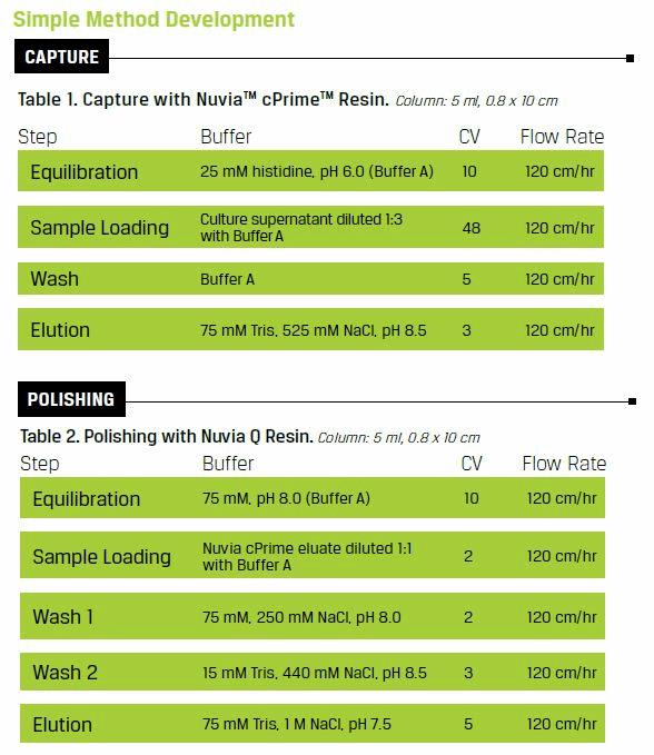 Initial capture was accomplished using Nuvia cPrime Mixed-Mode Resin (Figure 4). This portion of the process achieved a ten-fold reduction in processing volume and a significant reduction in feedstream contaminants (Figure 6, lanes 2–4).