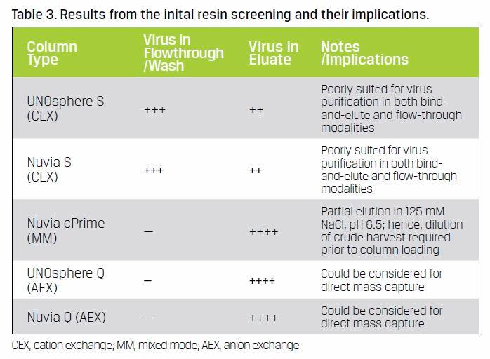 Initial screening showed that of the five resins selected three resins had potential for use in a mass capture process — Nuvia cPrime (hydrophobic cation exchange), UNOsphere™ Q (anion exchange), and Nuvia Q (anion exchange) — since the virus was not detected in either the flow-through or wash fractions (Table 3). Nuvia cPrime was selected for capturing the adenovirus as it offered the best clearance of feedstream contaminants. Eluate from this hydrophobic cation exchange resin could be loaded onto the subsequent column following a simple pH adjustment. Fouling of anion exchange chromatography resins in process manufacturing (Close et al. 2013, Drevin et al. 1989) and difficulties in their regeneration (Ng and McLaughlin 2007) have been reported due to the binding of excessive amount of impurities and ineffective cleaning. Therefore, the Q resins are more suitable for polishing purification. Between the two strong anion exchange resins, Nuvia Q was chosen for its higher binding capacity for target virus even in the presence of high NaCl concentrations.