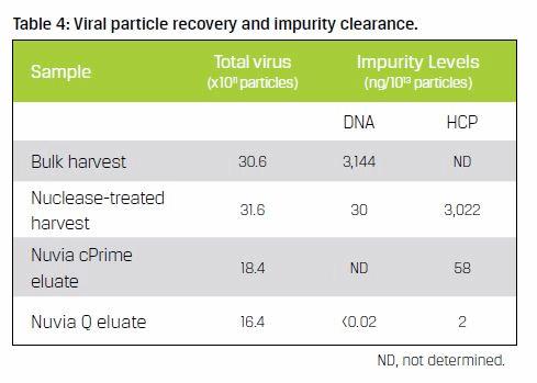 Virus concentration and DNA levels were evaluated at select points along the downstream process (Table 4). The data demonstrates an overall recovery of virus particles of approximately 54% ng/1013, with DNA levels below detection and HCP at 2 ng/1010 particles. These values are well within current guidelines for clinical and perhaps commercial use.