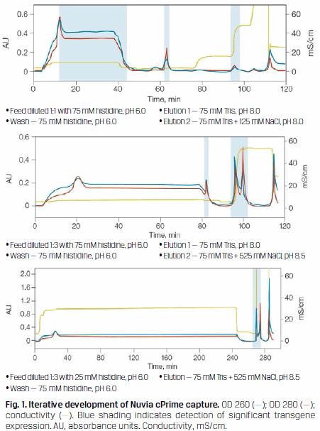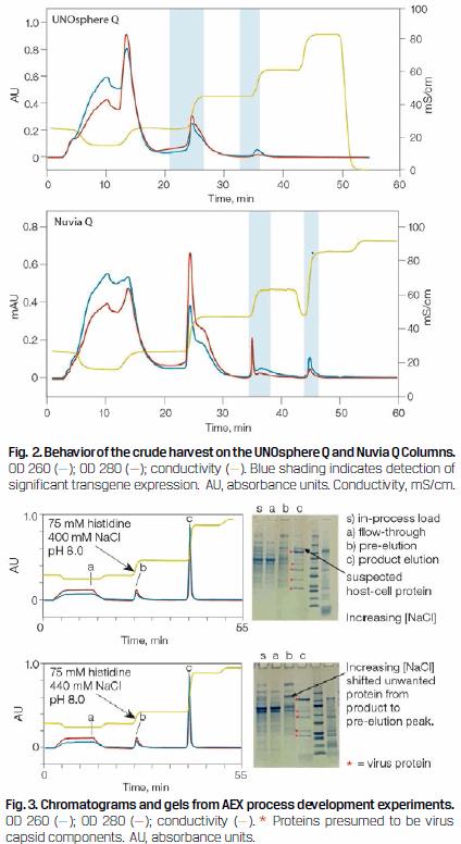 A nuclease digestion was introduced prior to column loading to aid in nucleic acid clearance. Initial mass capture experiments were focused on reducing feedstream volumes and recovering virus. The chromatograms in Figure 1 illustrate the early progression of these experiments and indicate when significant transgene expression was detected.