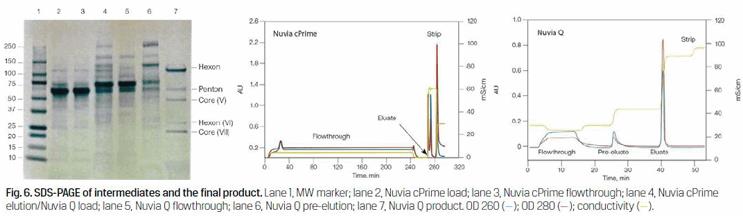 Final virus purification was accomplished using Nuvia Q Resin (Figure 5). This portion of the process achieved an additional two-fold reduction of product volume along with a significant improvement in product purity (Figure 6, lanes 4–7). Following this operation, nonvirus proteins were no longer evident by SDS-PAGE (Figure 6, lane 7).