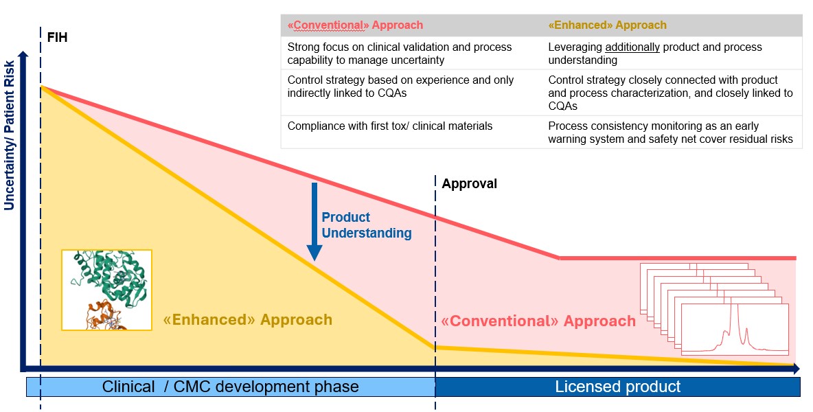 At the start of the clinical trial phase, safety uncertainty is at its highest. Several measures ensure an acceptable uncertainty level before trials begin. As trials progress, uncertainty about safety and efficacy decreases. At the CMC level, in-depth characterization and definition of critical quality attributes (CQAs) can reduce uncertainty more quickly and reliably. This allows for a more focused control strategy, enabling high control and less uncertainty in the event of a deviation or necessary change in the manufacturing process or analytical control.