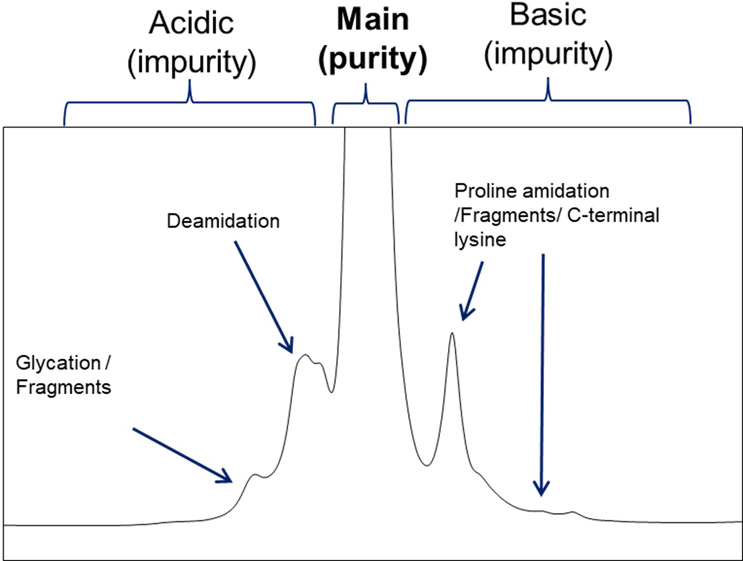 Biological products like IgGs consist of many variants. Sensitive analytical technologies, such as ion exchange liquid chromatography, reliably quantify different charge variant groups (figure 2). This technology detects differences in charge distribution from manufacturing variability or product degradation during storage. Consequently, charge assays monitor process consistency with respect to historical charge profiles. Defining quantitative batch acceptance criteria for major charge variants, such as sum of acidic variants, sum of basic variants, and main variants, allows for limiting the content of variant groups in future batches to those present in clinical trial material. As a result, authorities often request tight batch reject limits for the peak groups.