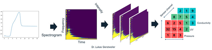 Figure 1: Converting Sensor Signals Into Artificial “Images.” This flowchart demonstrates how raw signals (e.g., UV, pressure, conductivity) are converted into spectrograms and combined into red, green, and blue (RGB) channels. This approach enables the fine-tuning of pretrained image classification models for biomanufacturing applications.