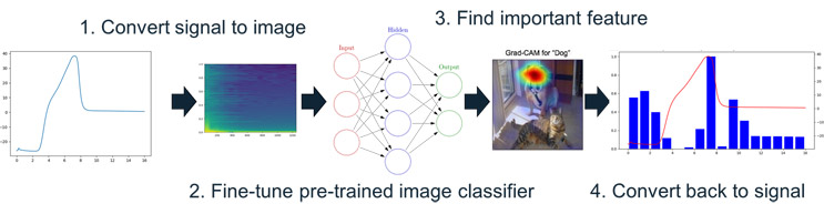 Figure 3: High-Level Workflow For Explainable ML In Biomanufacturing. First the raw sensor signals are converted into artificial images, which are then used to fine-tune a pretrained image-classification. Explainable machine techniques are then used to highlight important features on the artificial images (made out of sensor signals). Finally, this is converted back to the original sensor signals to identify relevant sensors and time periods in the process for practical process insights.