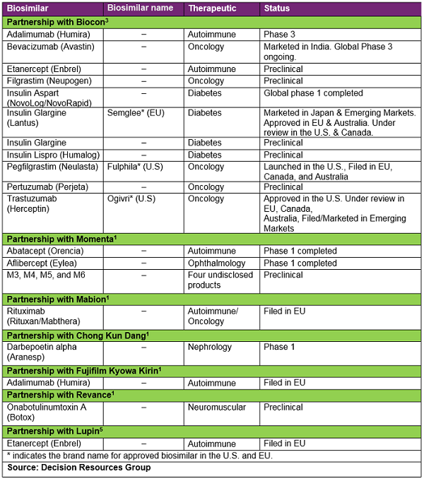 Mylan’s company partnerships to date have expanded its access to different biosimilars and given it more rapid access to key biosimilar markets. These partnerships, which have expanded Mylan’s product footprint beyond its previous portfolio, have set the company up as a leading player in the biosimilar space, and based on the pace of recent deals and sentiment from investor presentations, its momentum in this field appears set to continue.