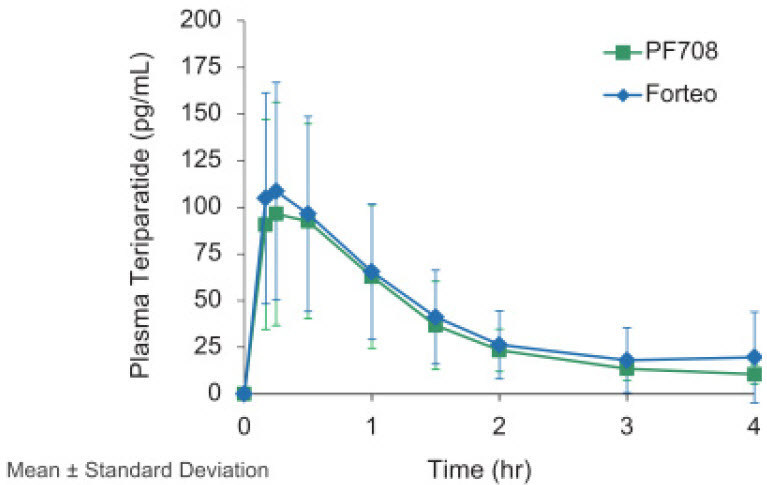 Today, Pfenex is pleased to announce the interim pharmacokinetic (PK) results from ongoing Study PF708-301, which compares the effects of PF708 and Forteo in osteoporosis patients. PF708 is a teriparatide product candidate that is being developed through the 505(b)(2) regulatory pathway in the US and references Forteo®, marketed by Eli Lilly for the treatment of osteoporosis patients at a high risk of fracture, as the Reference Listed Drug. Study PF708-301 completed enrollment in the third quarter of 2017 with a total of 181 patients – 90 randomized to PF708 and 91 to Forteo. The primary study endpoint is anti-drug antibody formation after 24 weeks of drug treatment. The secondary study endpoints are changes in bone mineral density and bone turnover markers after 24 weeks of drug treatment, as well as PK parameters for up to 4 hours after the first dose.