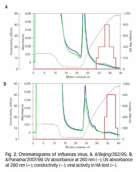 Chromatography of influenza virus A/Beijing/262/95 and A/Panama/2007/99 (Schickli et al. 2001) cultured in the presence of 0.02% and 0.20% BSA, respectively, is shown in Figure 2.