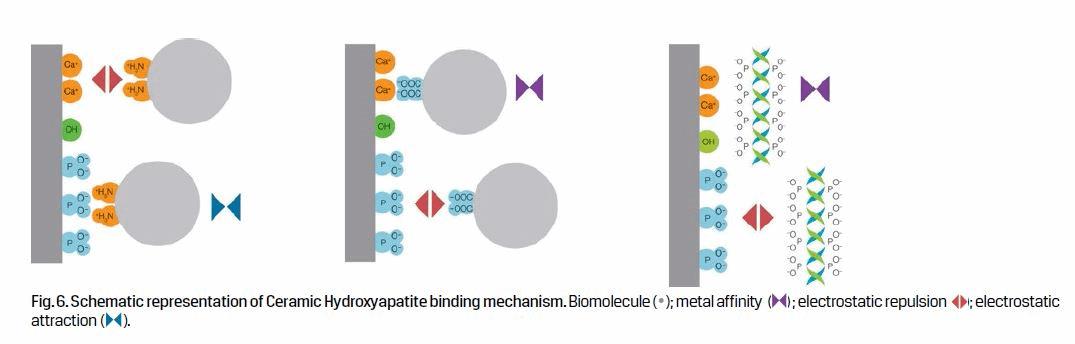 CHT Ceramic Hydroxyapatite is a spherical, macroporous form of hydroxyapatite. It is manufactured by sintering at high temperatures to be converted from a nanocrystalline to ceramic form. Unlike most other chromatography adsorbents, CHT is both the ligand and the support matrix. As shown in Figure 6, hydroxyapatite contains two types of binding sites; positively charged calcium and negatively charged phosphate groups. These sites are distributed throughout the crystal structure of the matrix.