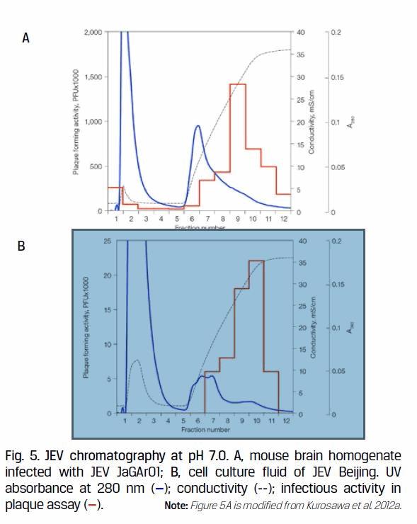 Japanese encephalitis virus (JEV) chromatography is shown in Figure 5 (Kurosawa et al. 2009, 2012a). Irrespective of the source or strain, the virus was eluted at approximately 350 mM sodium phosphate (note that the gradient used in these two cases was 10–400 mM and the column size is 6.8 x 20 mm). Again, there is good separation between protein contamination and the virus.