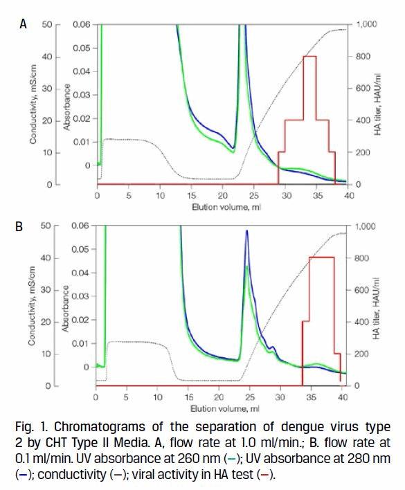 Figure 1A shows the recovery of dengue virus type 2 from cell culture fluid. HA activity was recovered near the end of the gradient, separated from the bulk of A280-absorbing material and from dsDNA (Kurosawa et al. 2012b). Figure 1B demonstrates that decreasing the flow rate by tenfold improves the sharpness of the elution peaks and, hence, separation. In both cases, recovery of HA activity was greater than 95%. Recent studies have indicated that adsorption of dengue virus particles to the surface of CHTTM Ceramic Hydroxyapatite Type II Media is similar to their adsorption to cells (Saito et al. 2013).