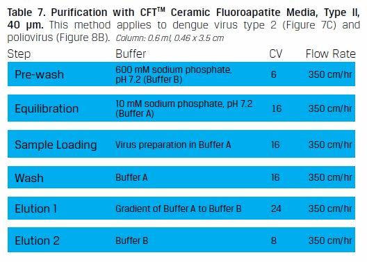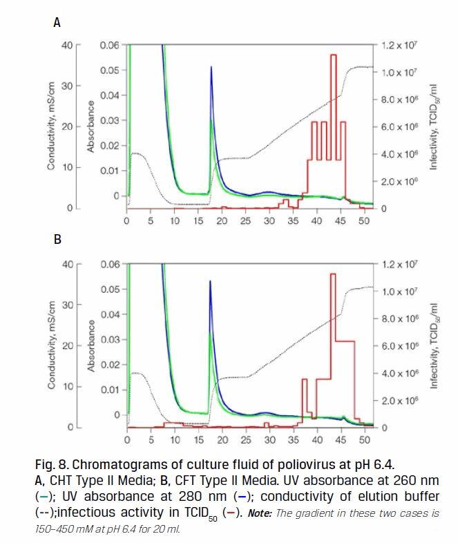 Figure 8 shows a similar study using CHT Type II and CFT Type II Media for the purification of poliovirus, with recoveries of 88% and 102%, respectively. These results illustrate the importance of choosing the appropriate media for the separation in question.