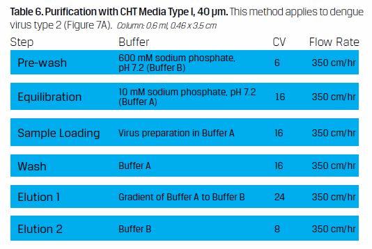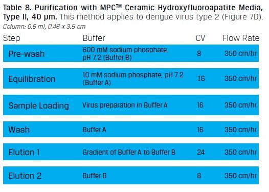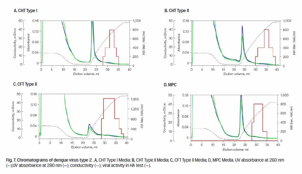 Figure 7 shows the separation of dengue virus type 2 from cell culture contaminants on four apatites: CHT Type I, CHT Type II, CFT Type II, and MPC Media. Yields were 80% or higher for each media type except for MPC, where the yield was 50%. Although binding and elution was achieved on all four media, the separation of virus from impurities was best on CHT Type II Media.