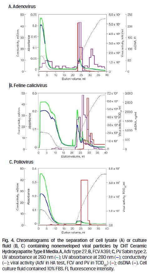 Nonenveloped viral particles can be purified by ceramic hydroxyapatite chromatography in the same way as enveloped viruses. Adenovirus (AdV) type 27, feline calicivirus (FCV) A391 (Hirano et al. 1986), and poliovirus (PV) Sabin type 2 were all adsorbed to CHT Type II Media (Figure 4), although they showed different elution times.