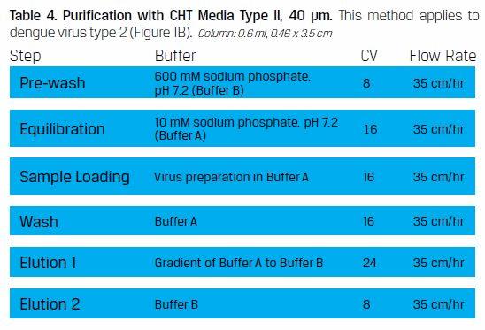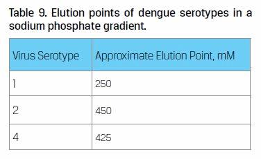 Other serotypes of dengue virus were also bound to and eluted from CHT Type II Media. The approximate elution points in the sodium phosphate gradient for each serotype are shown in Table 3. Types 2 and 4 were eluted at roughly the same sodium phosphate concentration.