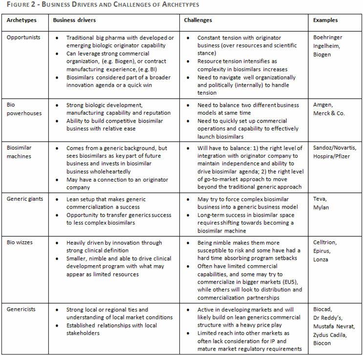 As the market continues to evolve, this framework of archetypes helps us to understand and anticipate the likely paths that companies will follow in their pursuit of biosimilar success. It may also help companies with products facing biosimilar competition in the near future to better prepare a more targeted strategy that takes into consideration the strengths and weaknesses of their competitors. Figure 2 sets out the main business drivers and challenges for each archetype.
