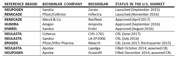 To date, the FDA has accepted 17 dossiers for review (of the 17, it has approved five and has issued at least four CRLs), but this is only the beginning — 17 additional dossiers are expected to be accepted for review by the end of 2017 alone. In total, 43 biosimilars targeting the U.S. market are in clinical development, with the majority of those in Phase 3 development. Over the past five years, the number of biosimilar R&D projects in the United States has increased significantly, following the definition of the biosimilar regulatory pathway in 2010, issuance of guidance from the FDA since 2012, nearing the time when top-selling branded drugs are coming off patent, and reflects the opportunity for significant revenues for biosimilar developers that enter the U.S. market early. Top brands targeted by biosimilar manufacturers include Humira, Genentech/Roche’s Herceptin and Avastin, and Amgen’s Neulasta, which together represent a market of approximately $20 billion in 2016.
