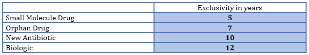 In BIO’s statement about the USMCA, they noted that the agreement “prioritize(s) biotechnology innovation.”4 On this point they are entirely correct. In the U.S., we have for some time now had a system of granting exclusivity that gives some therapies greater terms of exclusivity than others, and biologics have the longest period under current law. The chart below shows exclusivity in the U.S. by product type.