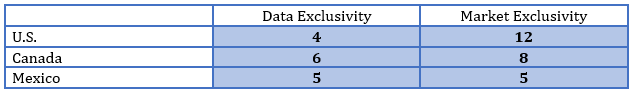 The plain text of Chapter 20 of the USMCA, indicates that the drafters intend “market protection” for “at least ten years from the date of first marketing approval.”3 I believe it would be a mistake to refer to this 10-year period as a data exclusivity, keeping in mind that the agreement represents only a minimum and implementation is key. The delta between the data exclusivity and the market exclusivity must be great enough to give a health authority the time necessary to review a submission. Otherwise, the market exclusivity is by default a longer term – in this case, 10 years plus administrative delay. It would benefit Canada and Mexico to keep this in mind, provided the agreement is ratified, and they move to implementation.